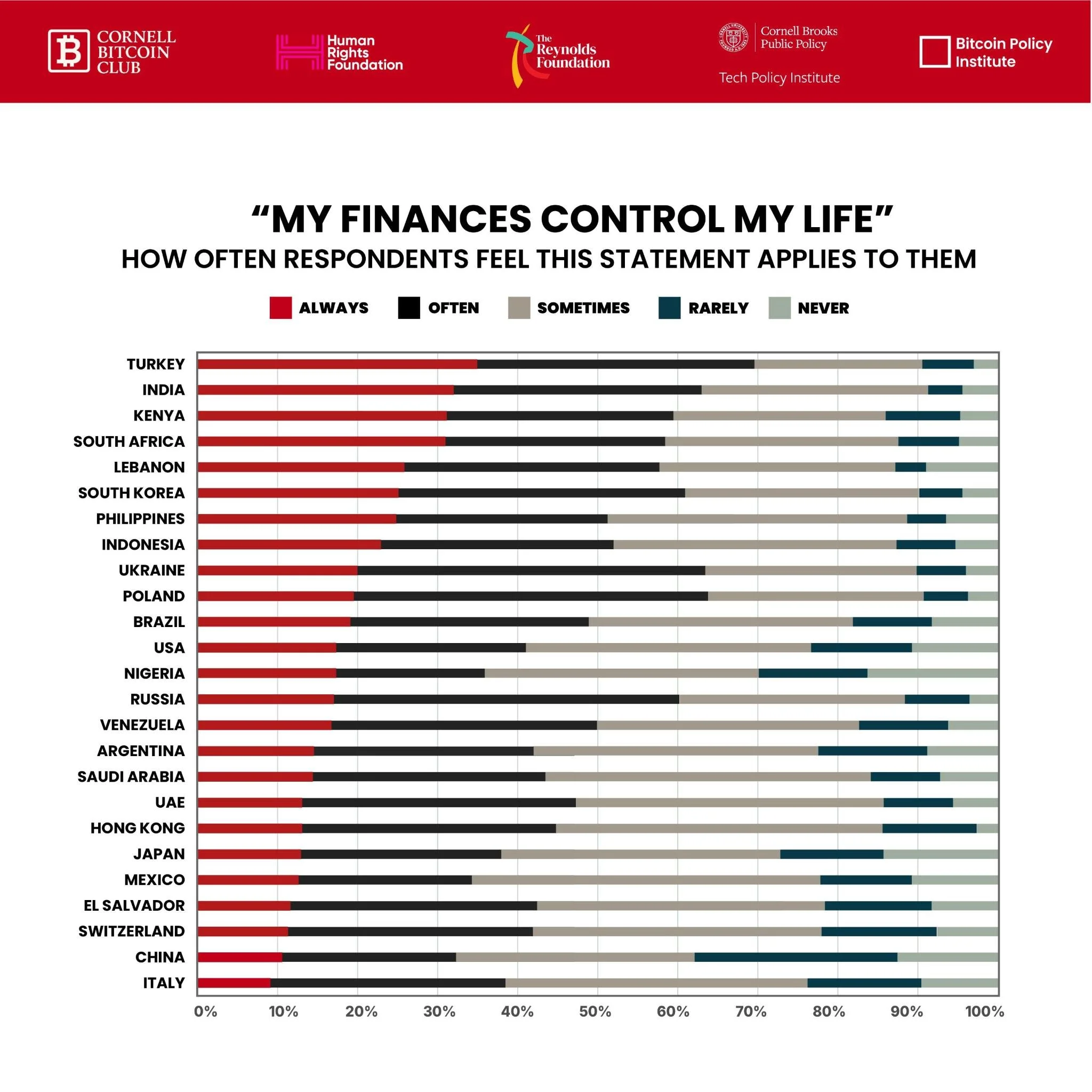 We asked respondents whether they agreed with the statement: “My finances control my life.” This chart offers emotional context, showing how financial stress varies globally and may influence openness to alternative financial systems.